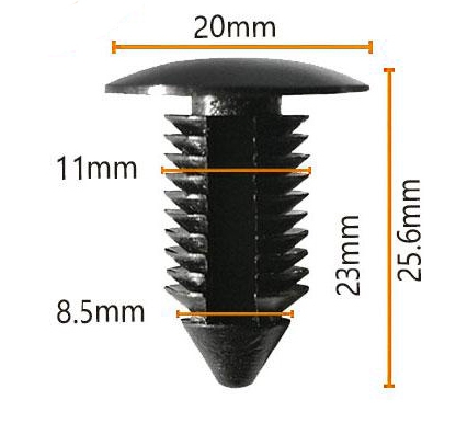 A rögzítőelem teljes hossza 25,6 mm, a szélesség 20 mm, a fejmagasság 11 mm.